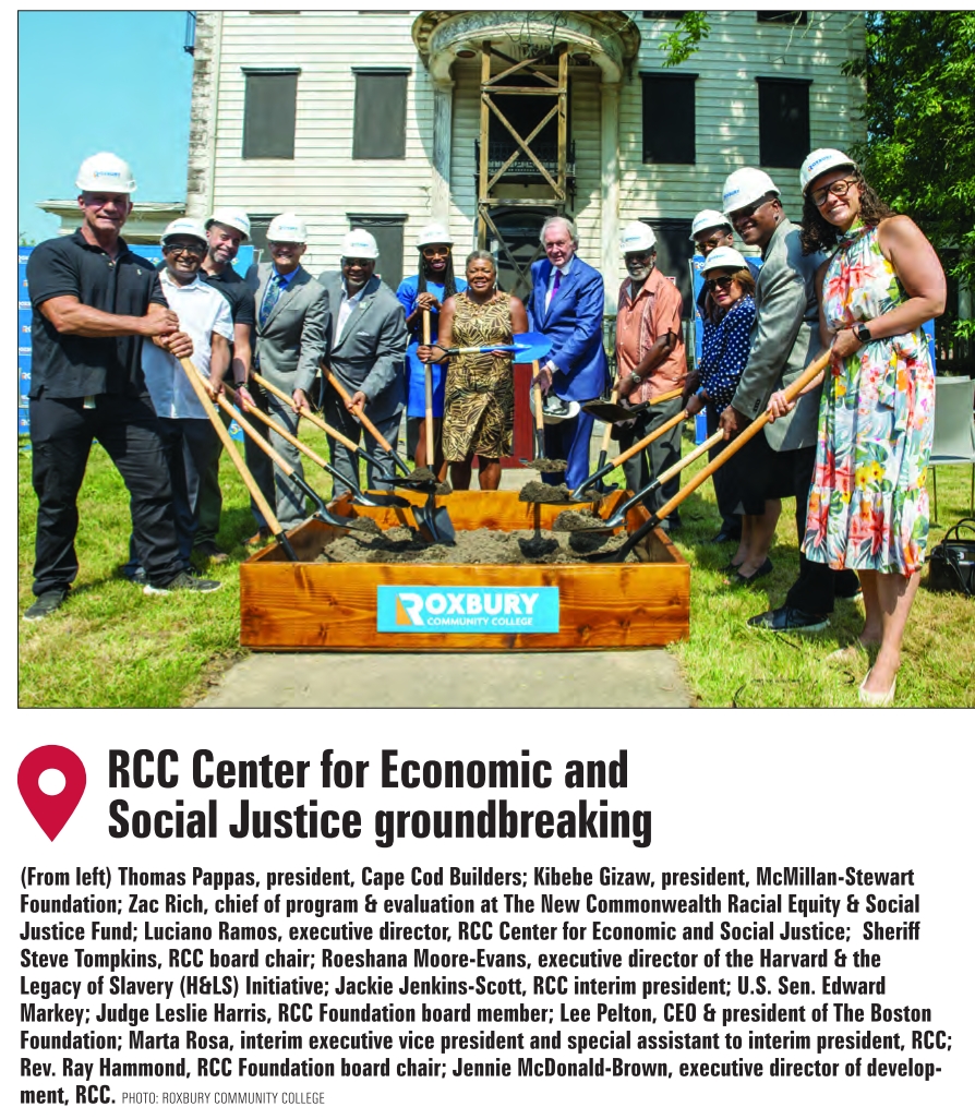 RCC Center for Economic and Social Justice groundbreaking (From left) Thomas Pappas, president, Cape Cod Builders; Kibebe Gizaw, president, McMillan-Stewart Foundation; Zac Rich, chief of program & evaluation at The New Commonwealth Racial Equity & Social Justice Fund; Luciano Ramos, executive director, RCC Center for Economic and Social Justice; Sheriff Steve Tompkins, RCC board chair; Roeshana Moore-Evans, executive director of the Harvard & the Legacy of Slavery (H&LS) Initiative; Jackie Jenkins-Scott, RCC interim president; U.S. Sen. Edward Markey; Judge Leslie Harris, RCC Foundation board member; Lee Pelton, CEO & president of The Boston Foundation; Marta Rosa, interim executive vice president and special assistant to interim president, RCC; Rev. Ray Hammond, RCC Foundation board chair; Jennie McDonald-Brown, executive director of development, RCC. PHOTO: ROXBURY COMMUNITY COLLEGE See also
