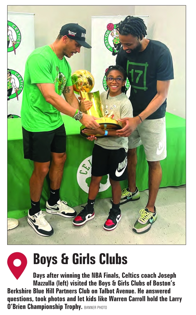 Boys & Girls Clubs Days after winning the NBA Finals, Celtics coach Joseph Mazzulla (left) visited the Boys & Girls Clubs of Boston’s Berkshire Blue Hill Partners Club on Talbot Avenue. He answered questions, took photos and let kids like Warren Carroll hold the Larry O’Brien Championship Trophy. BANNER PHOTO