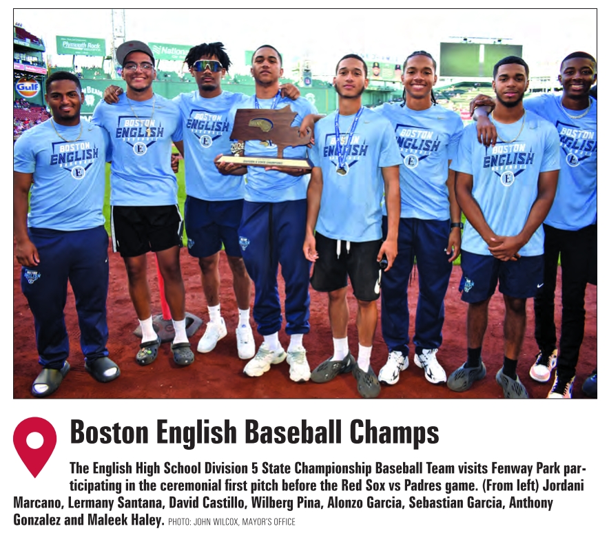 Boston English Baseball Champs The English High School Division 5 State Championship Baseball Team visits Fenway Park participating in the ceremonial first pitch before the Red Sox vs Padres game. (From left) Jordani Marcano, Lermany Santana, David Castillo, Wilberg Pina, Alonzo Garcia, Sebastian Garcia, Anthony Gonzalez and Maleek Haley. PHOTO: JOHN WILCOX, MAYOR’S OFFICE See also