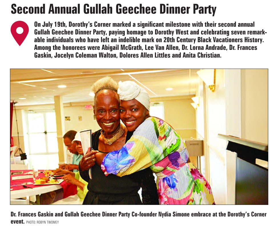 Second Annual Gullah Geechee Dinner Party On July 19th, Dorothy’s Corner marked a significant milestone with their second annual Gullah Geechee Dinner Party, paying homage to Dorothy West and celebrating seven remarkable individuals who have left an indelible mark on 20th Century Black Vacationers History. Among the honorees were Abigail McGrath, Lee Van Allen, Dr. Lorna Andrade, Dr. Frances Gaskin, Jocelyn Coleman Walton, Dolores Allen Littles and Anita Christian. Dr. Frances Gaskin and Gullah Geechee Dinner Party Co-founder Nydia Simone embrace at the Dorothy’s Corner event. PHOTO: ROBYN TWOMEY See also