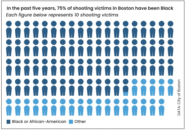 That work overwhelmingly impacts Boston’s Black communities. According to city data, within the past five years, there were 937 shootings logged by the Boston Police Department. In about three quarters of those, the victim was Black. Black residents made up over 80% of fatal shootings in the data.