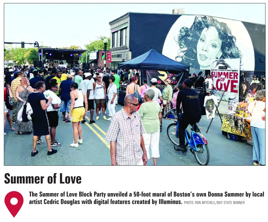 The Summer of Love Block Party unveiled a 50-foot mural of Boston’s own Donna Summer by local artist Cedric Douglas with digital features created by Illuminus. PHOTO: RON MITCHELL/BAY STATE BANNER