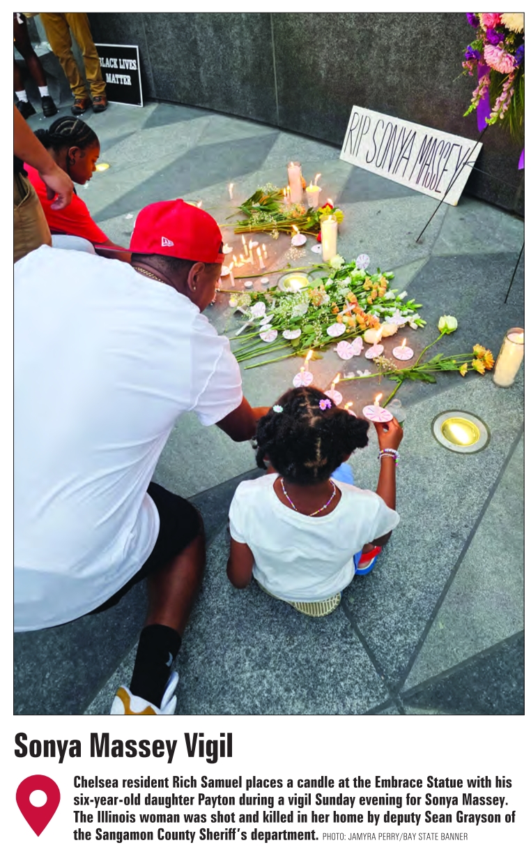 Chelsea resident Rich Samuel places a candle at the Embrace Statue with his six-year-old daughter Payton during a vigil Sunday evening for Sonya Massey. The Illinois woman was shot and killed in her home by deputy Sean Grayson of the Sangamon County Sheriff’s department. PHOTO: JAMYRA PERRY/BAY STATE BANNER