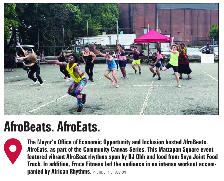The Mayor’s Office of Economic Opportunity and Inclusion hosted AfroBeats. AfroEats. as part of the Community Canvas Series. This Mattapan Square event featured vibrant AfroBeat rhythms spun by DJ Ohh and food from Suya Joint Food Truck. In addition, Froca Fitness led the audience in an intense workout accompanied by African Rhythms. PHOTO: CITY OF BOSTON