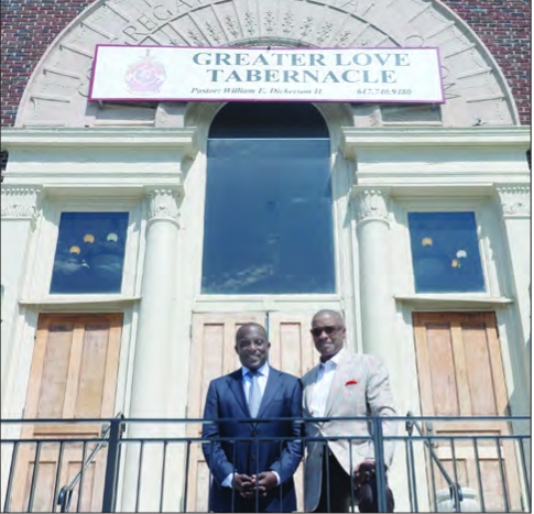Dunk the Vote founder Ron Bell (left) and Bishop William Dickerson III pose for a photo outside Greater Love Tabernacle Church.