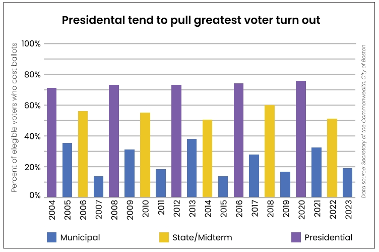 In the past two decades, voter turnout for state elections hovered around 50% to 60%, while, in each of the presidential elections pulled in upward of 70% of registered voters, per state data.
