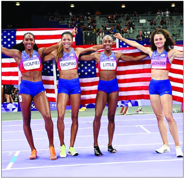 USA women’s 4 x 400 team (from left) Alexis Holmes, Gabby Thomas, Shamier Little and Sydney McLaughlin-Levrone