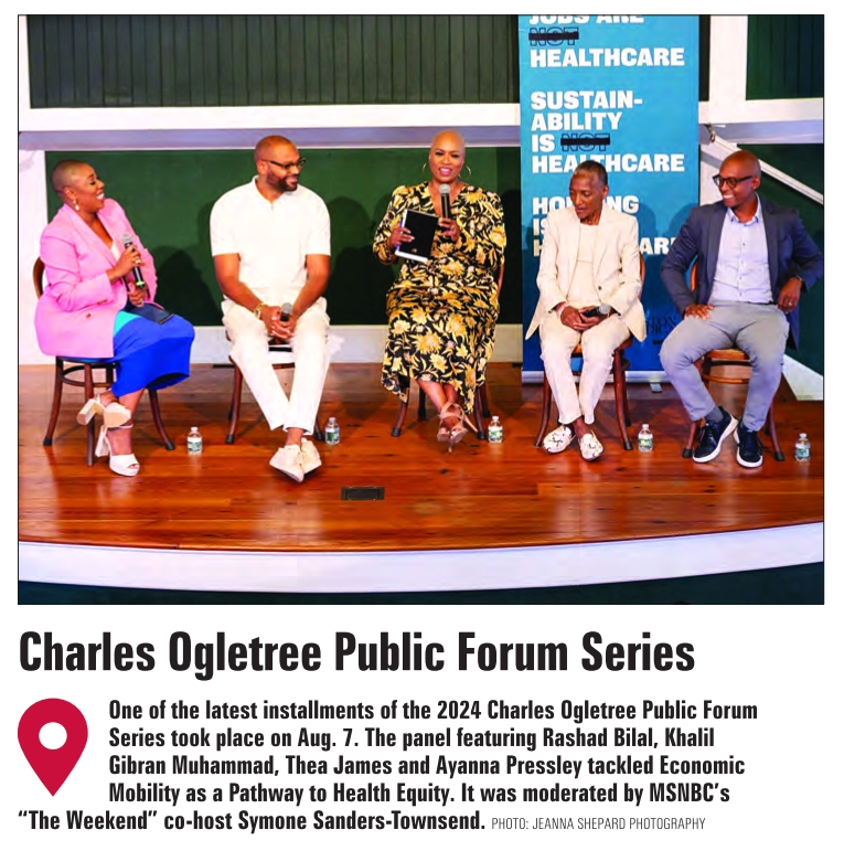 One of the latest installments of the 2024 Charles Ogletree Public Forum Series took place on Aug. 7. The panel featuring Rashad Bilal, Khalil Gibran Muhammad, Thea James and Ayanna Pressley tackled Economic Mobility as a Pathway to Health Equity. It was moderated by MSNBC’s