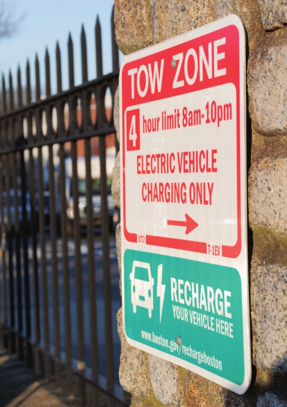 A sign marks an electric vehicle charging station at a municipal lot off Mattapan Square. State leaders are looking to promote electric vehicle uptake with increased charging infrastructure and better education about the vehicles.