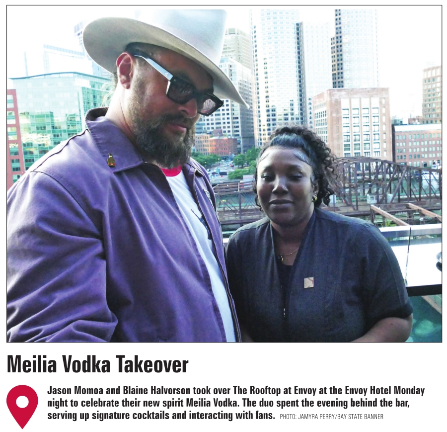 Jason Momoa and Blaine Halvorson took over The Rooftop at Envoy at the Envoy Hotel Monday night to celebrate their new spirit Meilia Vodka. The duo spent the evening behind the bar, serving up signature cocktails and interacting with fans. PHOTO: JAMYRA PERRY/BAY STATE BANNER
