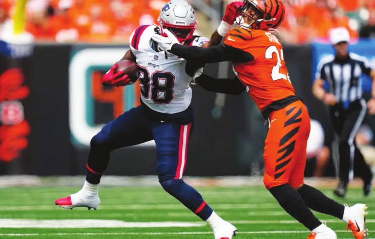 Rhamondre Stevenson stiff arms Geno Stone of the Bengals.