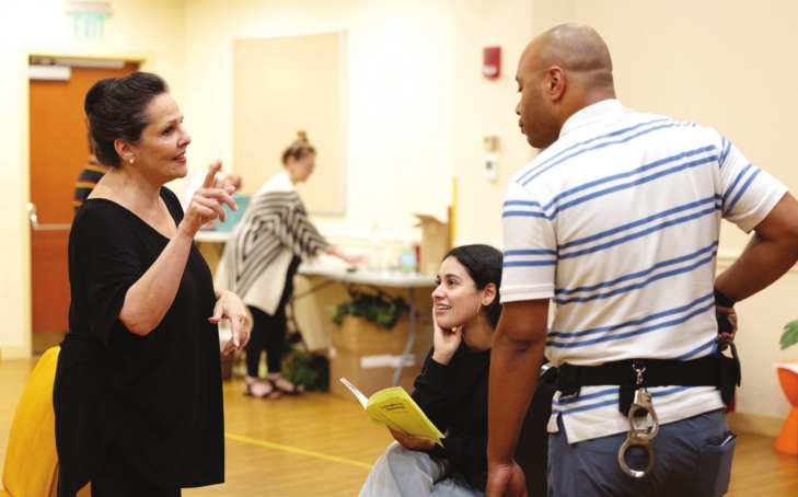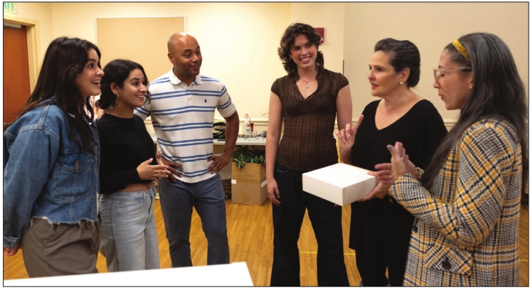Mariela López-Ponce shares a note with the cast. (from left) Rebekah