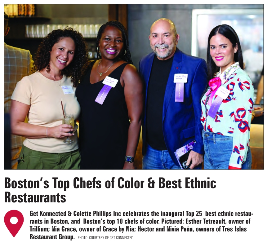 Get Konnected & Colette Phillips Inc celebrates the inaugural Top 25 best ethnic restaurants in Boston, and Boston’s top 10 chefs of color. Pictured: Esther Tetreault, owner of Trillium; Nia Grace, owner of Grace by Nia; Hector and Nivia Peña, owners of Tres Islas Restaurant Group. PHOTO: COURTESY OF GET KONNECTED