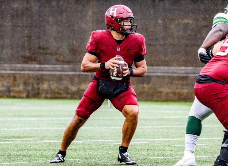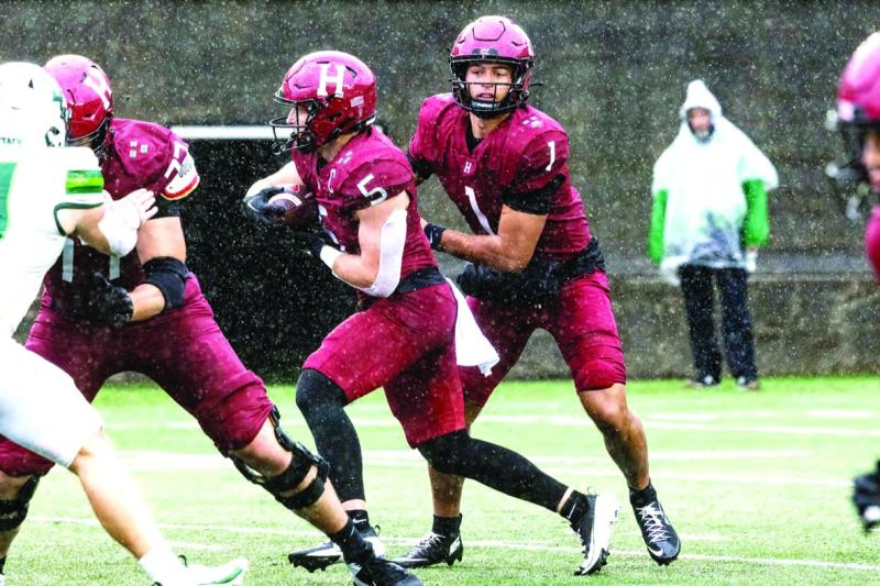 Harvard quarterback Jaden Craig hands off to running back Shane McLaughlin against Stetson University.