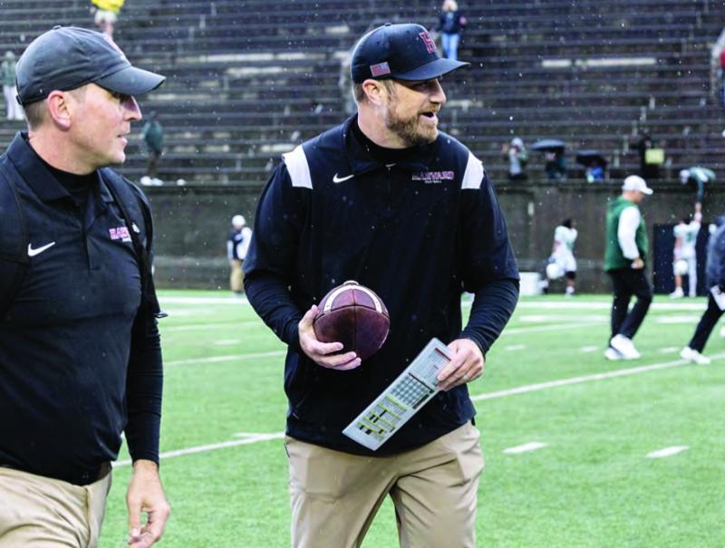Harvard football coach Micky Fein (left)) and head coach Andrew Aurich during pregame warmups
