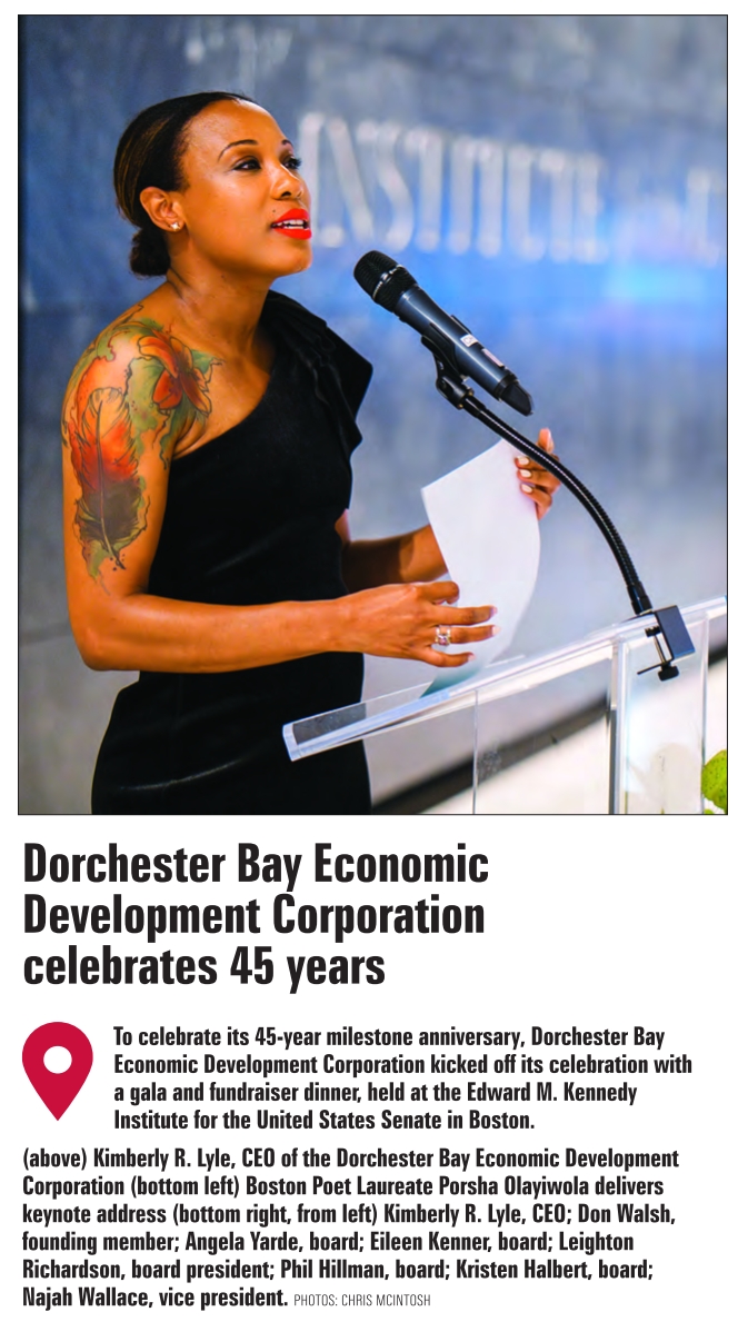 Dorchester Bay Economic Development Corporation celebrates 45 years To celebrate its 45-year milestone anniversary, Dorchester Bay Economic Development Corporation kicked off its celebration with a gala and fundraiser dinner, held at the Edward M. Kennedy Institute for the United States Senate in Boston. (above) Kimberly R. Lyle, CEO of the Dorchester Bay Economic Development Corporation (bottom left) Boston Poet Laureate Porsha Olayiwola delivers keynote address (bottom right, from left) Kimberly R. Lyle, CEO; Don Walsh, founding member; Angela Yarde, board; Eileen Kenner, board; Leighton Richardson, board president; Phil Hillman, board; Kristen Halbert, board; Najah Wallace, vice president. PHOTOS: CHRIS MCINTOSH See also