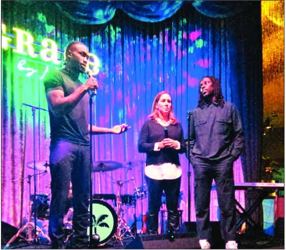 Jaylen Brown, Lauren Holiday and Jrue Holiday address the crowd at Grace by Nia during the Boston XChange Inaugural Cohort Dinner.