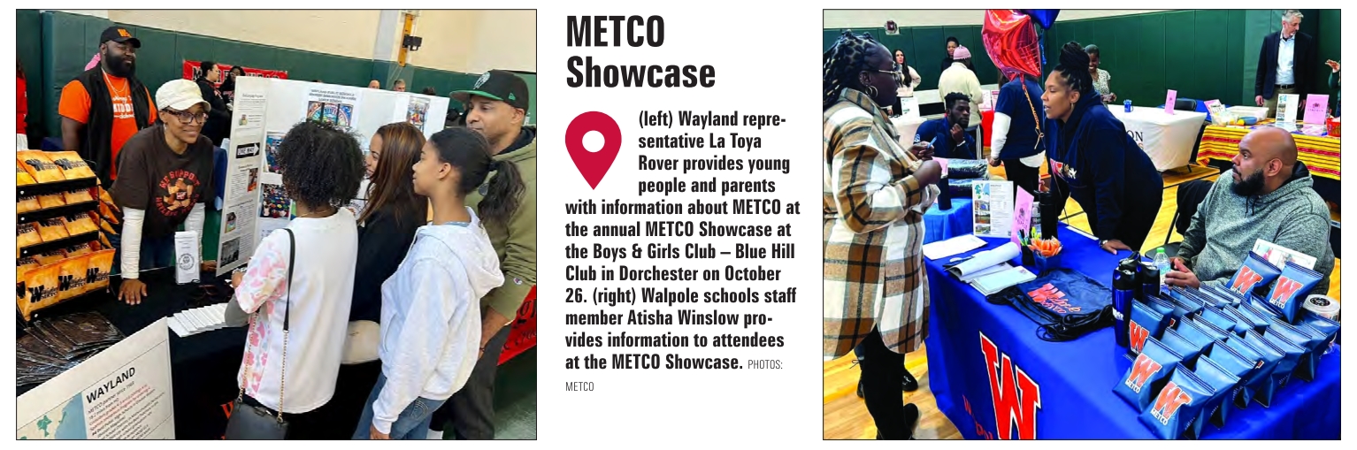 (left) Wayland representative La Toya Rover provides young people and parents with information about METCO at the annual METCO Showcase at the Boys & Girls Club – Blue Hill Club in Dorchester on October 26. (right) Walpole schools staff member Atisha Winslow provides information to attendees at the METCO Showcase. PHOTOS: