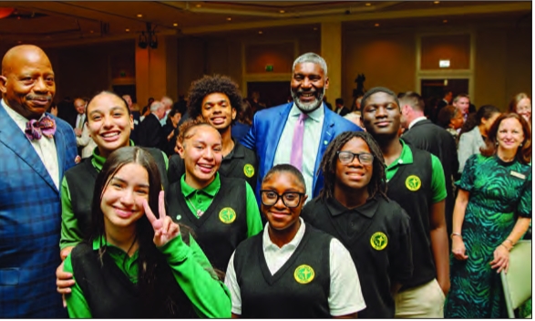 Students gala with attendees for a photo at the gala. (front) Garina Rodriguez ‘25, Janiya Simpson ‘27 (middle) J. Keith Motley, Amirah Rodriguez ‘25, Kelsey Savignano ‘25, Preston Daley ‘25, (back) Noah Glemaud ‘25, Paul Francisco, Michael JeanPierre ‘29, Nancy Caruso, Cathedral H.S. Director of Advancement