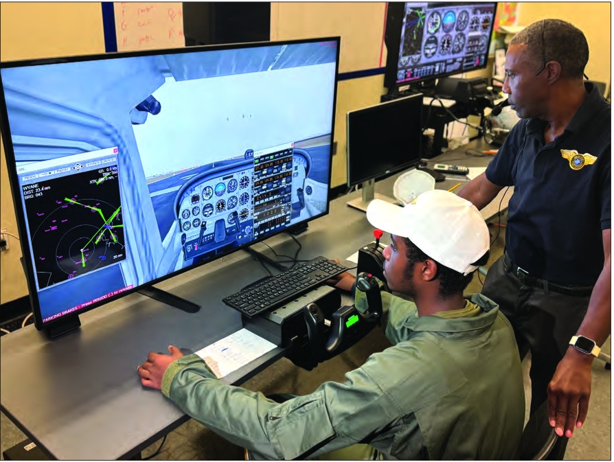 Student Fahad Yasin, seated, works the flight simulator as flight program director Marcus James looks on. School’s STEM Flight Academy holds ceremony and open house
