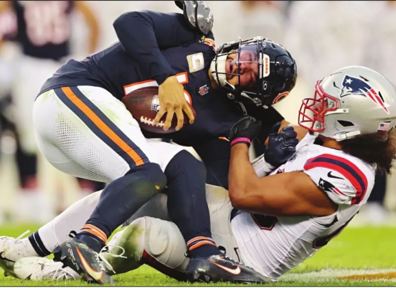 Patriots safety Brenden Schooler sacks Chicago quarterback Caleb Williams.