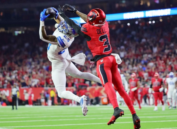 Detroit Lions cornerback Carlton Davis III intercepts the ball in front of Texans wideout Tank Dell.