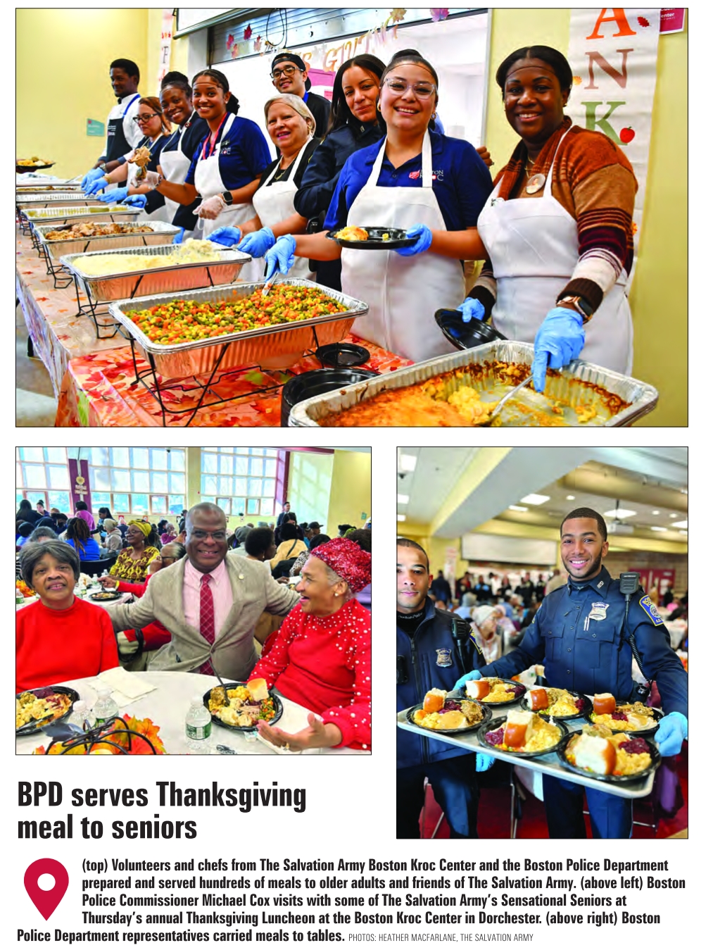 BPD serves Thanksgiving meal to seniors (top) Volunteers and chefs from The Salvation Army Boston Kroc Center and the Boston Police Department prepared and served hundreds of meals to older adults and friends of The Salvation Army. (above left) Boston Police Commissioner Michael Cox visits with some of The Salvation Army’s Sensational Seniors at Thursday’s annual Thanksgiving Luncheon at the Boston Kroc Center in Dorchester. (above right) Boston Police Department representatives carried meals to tables. PHOTOS: HEATHER MACFARLANE, THE SALVATION ARMY See also