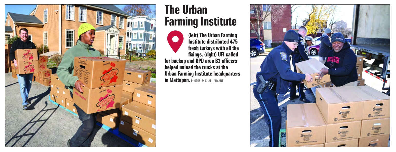 The Urban Farming Institute (left) The Urban Farming Institute distributed 475 fresh turkeys with all the fixings. (right) UFI called for backup and BPD area B3 officers helped unload the trucks at the Urban Farming Institute headquarters in Mattapan. PHOTOS: MICHAEL BRYANT See also