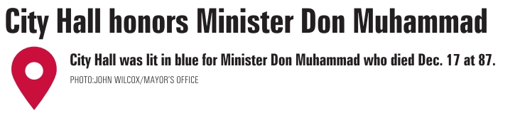 City Hall was lit in blue for Minister Don Muhammad who died Dec. 17 at 87.