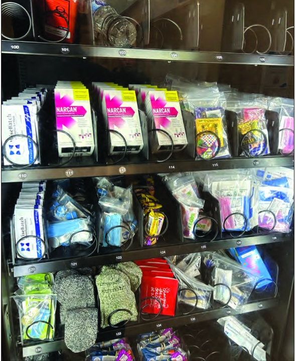 The contents of a new harm reduction vending machine are shown at the Boston Public Health Commission’s Recovery Services office in the Boston Medical Center Finland Building. For four organizations in Boston, new vending machines won’t mean a snack to crunch on but rather access to opioid overdose-reversing medications and other harm reduction supplies.