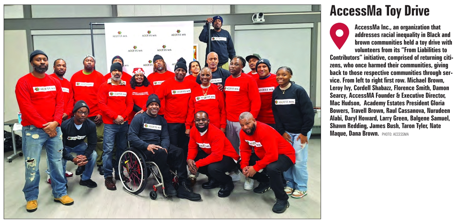 AccessMa Inc., an organization that addresses racial inequality in Black and brown communities held a toy drive with volunteers from its “From Liabilities to Contributors” initiative, comprised of returning citizens, who once harmed their communities, giving back to those respective communities through service. From left to right first row. Michael Brown, Leroy Ivy, Cordell Shabazz, Florence Smith, Damon Searcy, AccessMA Founder & Executive Director, Mac Hudson, Academy Estates President Gloria Bowers, Travell Brown, Raul Cassanova, Nurudeen Alabi, Daryl Howard, Larry Green, Balgene Samuel, Shawn Redding, James Bush, Taron Tyler, Nate Maque, Dana Brown. PHOTO: ACCESSMA