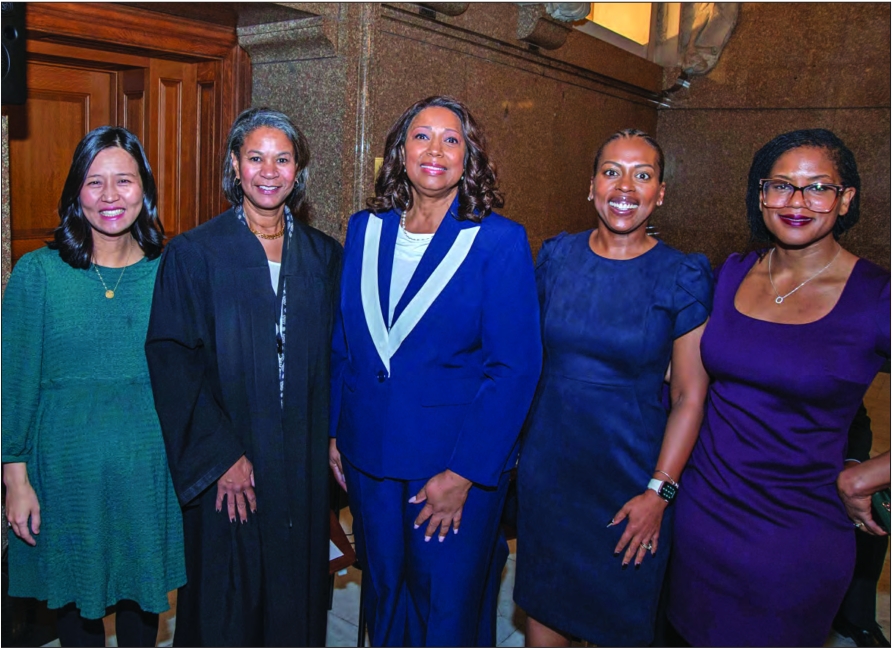 Boston Mayor Michelle Wu, Supreme Judicial Court Chief Justice Kimberly Budd, Supreme Judicial Court clerk for Suffolk County Allison Cartwright, Suffolk Register of Probate Stephanie Everett, and Sen. Lydia Edwards at Cartwright’s swearing-in ceremony on Jan. 1.