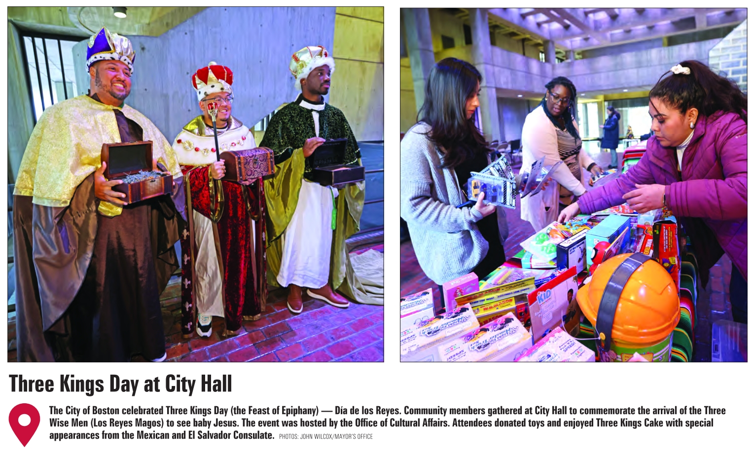 The City of Boston celebrated Three Kings Day (the Feast of Epiphany) — Día de los Reyes. Community members gathered at City Hall to commemorate the arrival of the Three Wise Men (Los Reyes Magos) to see baby Jesus. The event was hosted by the Office of Cultural Affairs. Attendees donated toys and enjoyed Three Kings Cake with special appearances from the Mexican and El Salvador Consulate. PHOTOS: JOHN WILCOX/MAYOR’S OFFICE