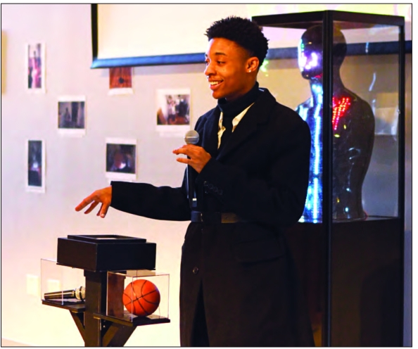The mannequin serves as a display for moving images playing on a loop. To interact with the piece, the public is free to place one of two boxes — one containing a basketball, the other a microphone — on the podium. Doing so will change the visual sequence, prompting questions about “the things that we choose to praise,” Berthaud said.