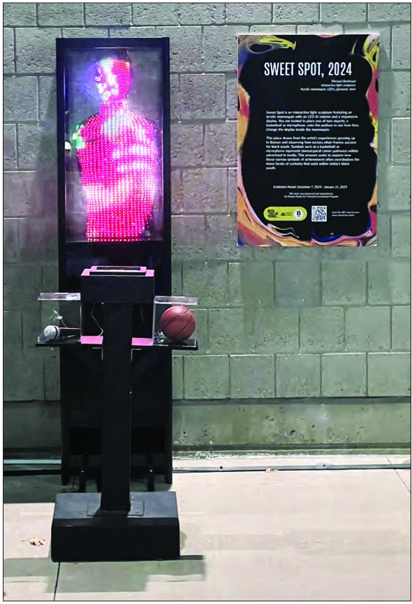 To create the artwork, Berthaud drew on his childhood as a first-generation Haitian growing up in Roxbury, a predominantly Black and Hispanic neighborhood, where he often saw music and basketball elevated as some of the stereotypical career paths available to youths of color. Standing in front of the piece on a recent Monday, Berthaud clarified that those options are indeed viable, but they can also be limiting.