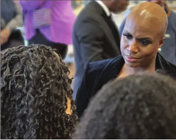 Rep. Ayanna Pressley listens to two attendees at an event she hosted for community members and activists in Roxbury on Martin Luther King Jr. Day.The celebrations of the Martin Luther King Jr. holiday and President Donald Trump’s second inaugural provided a stark contrast on Monday with several Massachusetts politicians pointedly skipping the Washington, D.C., event to stay close to home.