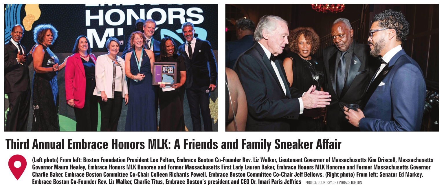 Third Annual Embrace Honors MLK: A Friends and Family Sneaker Affair (Left photo) From left: Boston Foundation President Lee Pelton, Embrace Boston Co-Founder Rev. Liz Walker, Lieutenant Governor of Massachusetts Kim Driscoll, Massachusetts Governor Maura Healey, Embrace Honors MLK Honoree and Former Massachusetts First Lady Lauren Baker, Embrace Honors MLK Honoree and Former Massachusetts Governor Charlie Baker, Embrace Boston Committee Co-Chair Colleen Richards Powell, Embrace Boston Committee Co-Chair Jeff Bellows. (Right photo) From left: Senator Ed Markey, Embrace Boston Co-Founder Rev. Liz Walker, Charlie Titus, Embrace Boston’s president and CEO Dr. Imari Paris Jeffries PHOTOS: COURTESY OF EMBRACE BOSTON See also