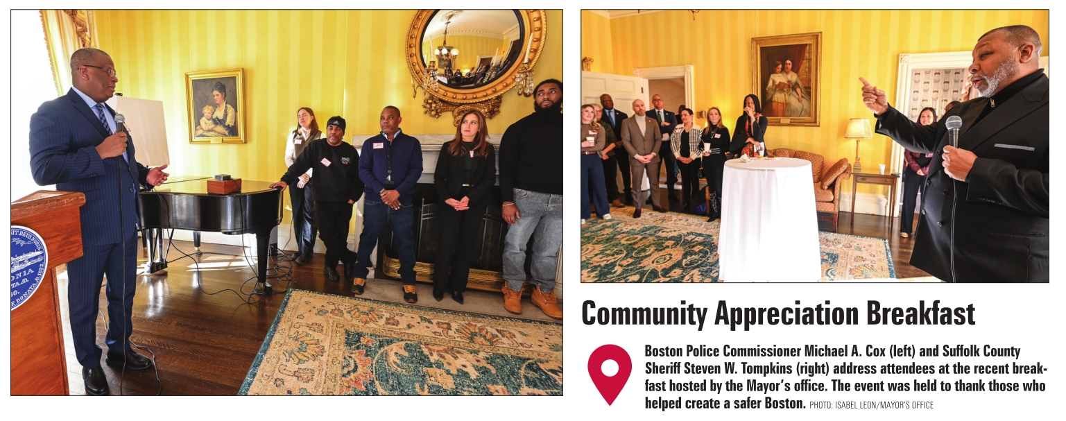 Community Appreciation Breakfast Boston Police Commissioner Michael A. Cox (left) and Suffolk County Sheriff Steven W. Tompkins (right) address attendees at the recent breakfast hosted by the Mayor’s office. The event was held to thank those who helped create a safer Boston. PHOTO: ISABEL LEON/MAYOR’S OFFICE See also