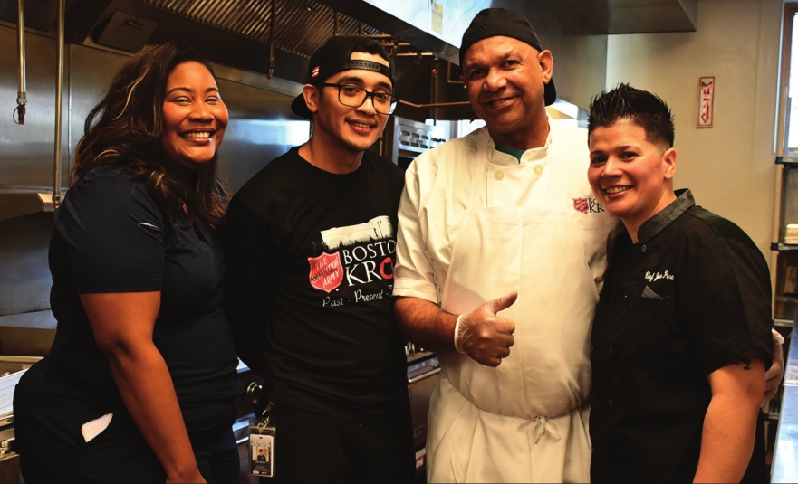 Chef Jesse Perez (far right) runs the Dorchester-based Salvation Army’s Boston Kroc Center Culinary Arts Training Program.