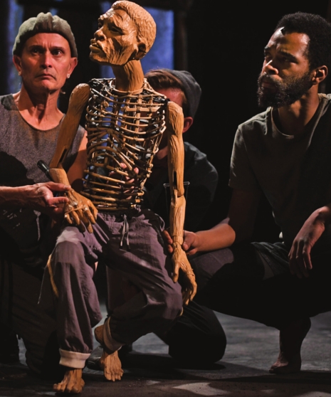 The actors work in tandem with master puppeteers throughout the show. This was Daniels’ first experience using puppetry and he describes it as a highly communal way of working. It often takes multiple people to control the puppet, with Daniels reciting dialogue and reacting to each scene.