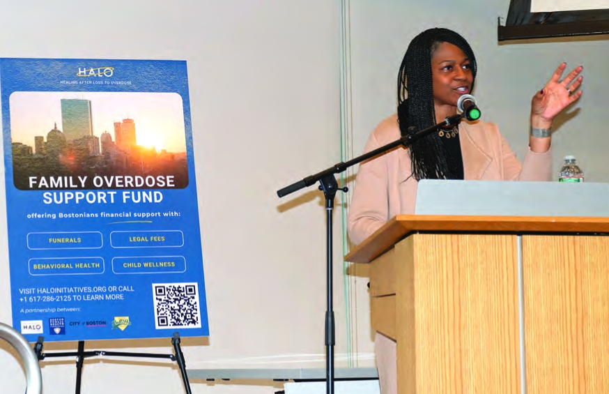 Dr. Bisola Ojikutu, Boston’s health commissioner, announces the city’s new family overdose support fund at the Bruce C. Bolling Municipal Building during the Jan. 29 meeting of the Nubian Square Task Force. The $250,000 fund will offer Boston residents who lost a family member to an opioid-overdose-related death up to $5,000 to cover costs like funeral expenses, legal services and mental health support.