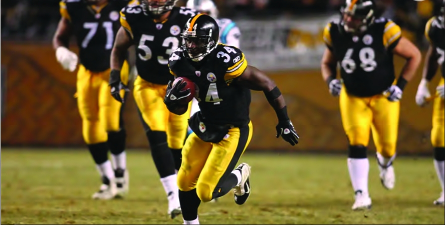 Steelers RB Rashard Mendenhall runs upfield.