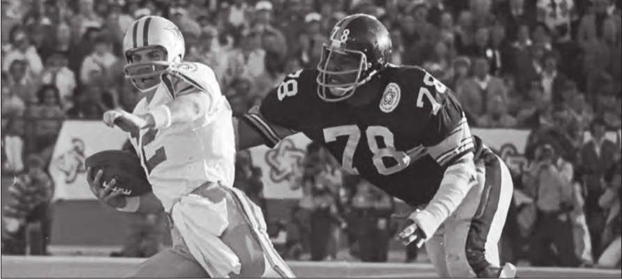 Steelers DE Dwight White wraps up Dallas QB Roger Staubach.