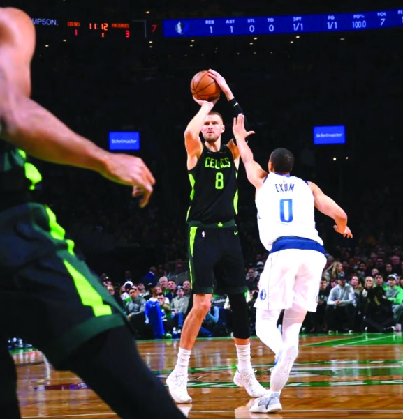 Celtics center Kristaps Porzingis sets up for a long 3.