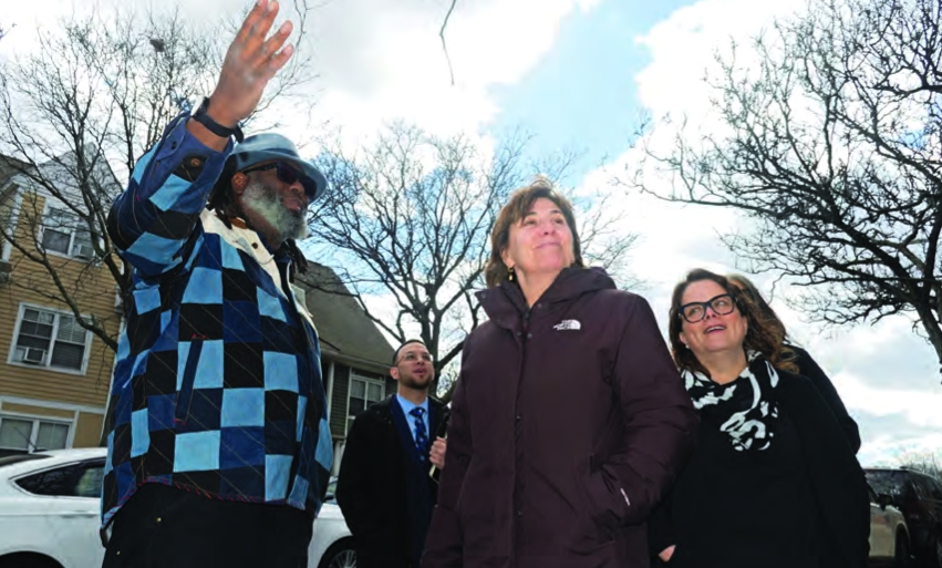 Dwaign Tyndal (left), executive director of Alternatives for Community and Environment, shows off Roxbury during a tour with Rebecca Tepper (center), Massachusetts secretary of energy and environmental affairs, and María Belén Power (right), environmental justice undersecretary, Feb. 26. The tour, led by ACE, highlighted various parts of Nubian Square’s history with environmental harms and justice.