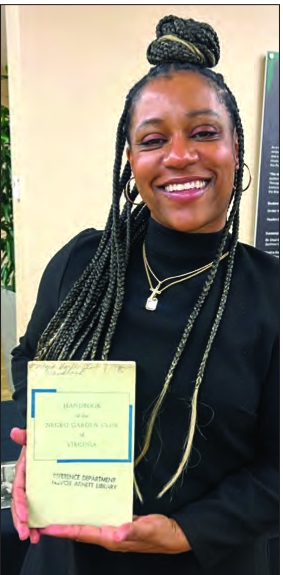 Abra Lee, horticulturalist and historian, holds a rare copy of the “Handbook of the Negro Garden Club of Virginia” after one of her lectures on Black garden history.