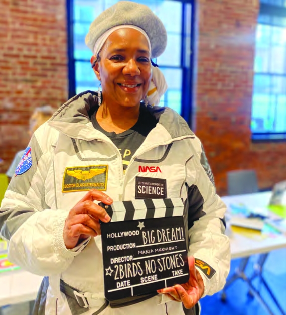 Maria McKnight in her costume for the “Boston Blackstronauts” program.As a parent, Maria McKnight wanted to take her young child to a place where they could have a productive play day in her neighbohood of Dorchester, instead of having to travel downtown or other out of the way children locations.