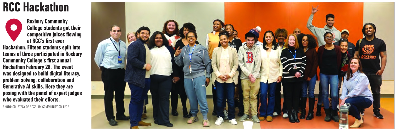 RCC Hackathon Roxbury Community College students got their competitive juices flowing at RCC’s first ever Hackathon. Fifteen students split into teams of three participated in Roxbury Community College’s first annual Hackathon February 28. The event was designed to build digital literacy, problem solving, collaboration and Generative AI skills. Here they are posing with the panel of expert judges who evaluated their efforts. PHOTO: COURTESY OF ROXBURY COMMUNITY COLLEGE See also