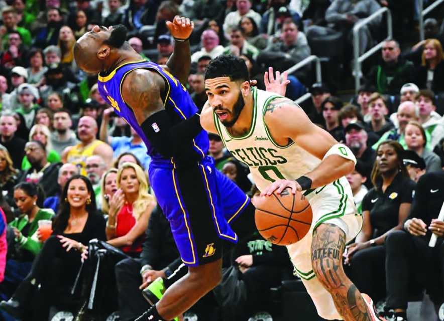 The Green’s Jayson Tatum drives by L.A.’s LeBron James.