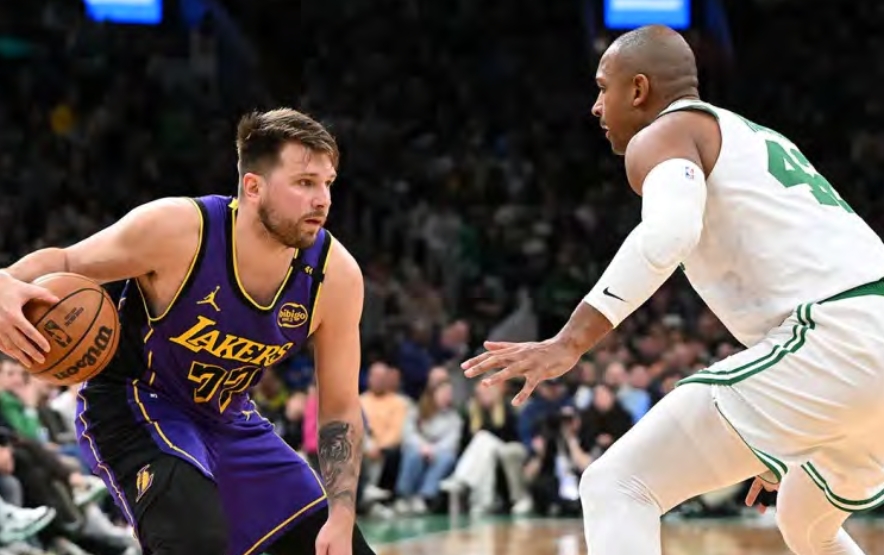 Forward Al Horford puts the D on Laker Luca Doncic.